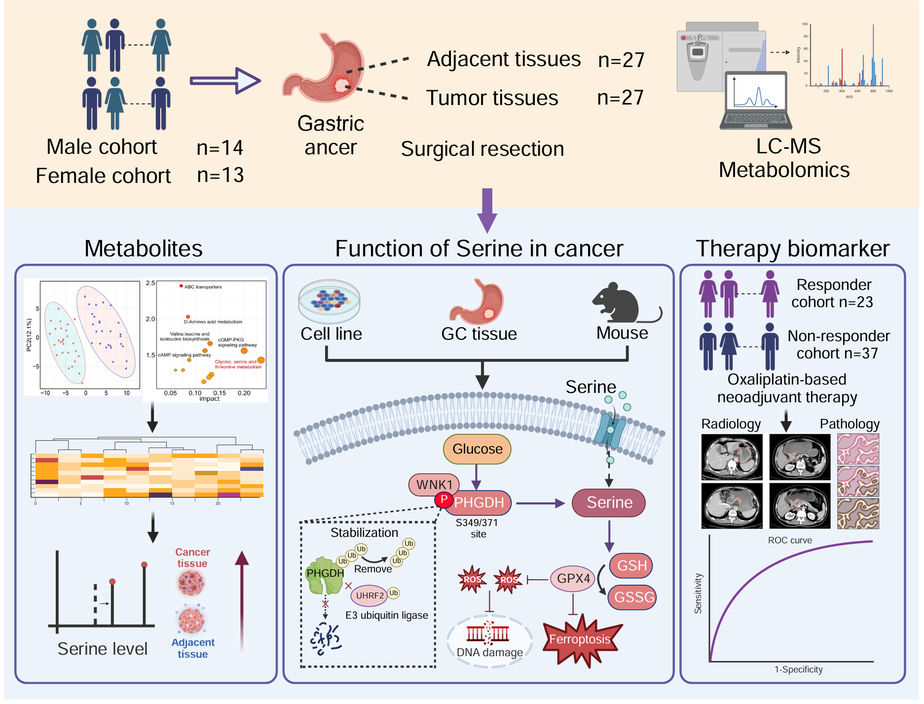 在胃癌代谢与化疗耐药研究中,发现胃癌组织中丝氨酸代谢显著异常,关键限速酶PHGDH的表达和活性明显升高,并受到上游激酶WNK1的直接调控。WNK1通过在PHGDH的Ser349和Ser371位点发生磷酸化修饰,增强其酶活性和蛋白稳定性,进而驱动丝氨酸代谢重编程,提升肿瘤细胞抗氧化防御和DNA损伤修复能力,降低其对奥沙利铂的治疗敏感性。进一步结合患者队列、类器官和动物模型研究表明,PHGDH磷酸化水平及丝氨酸代谢活性与奥沙利铂治疗反应密切相关,有望成为评估胃癌代谢脆弱性和化疗响应的潜在“双重生物标志物”。该研究揭示了“WNK1–PHGDH–丝氨酸代谢轴”在胃癌进展和化疗耐药中的重要作用,也为临床识别优势获益人群、优化新辅助化疗策略和开发联合干预方案提供了重要依据。该研究成果以《PHGDH phosphorylation mediated by WNK1 serves as a dual marker of metabolic vulnerability and responsiveness to oxaliplatin treatment》为题发表于顶尖期刊《PNAS》。郑州大学、中美(河南)荷美尔肿瘤研究院董子钢教授,阜外华中心血管病医院郭智萍教授、晋果果副教授担任共同通讯作者,博士研究生方少伯为论文的第一作者,由郑州大学、中美(河南)荷美尔肿瘤研究院、天健先进生物医学实验室共同完成。