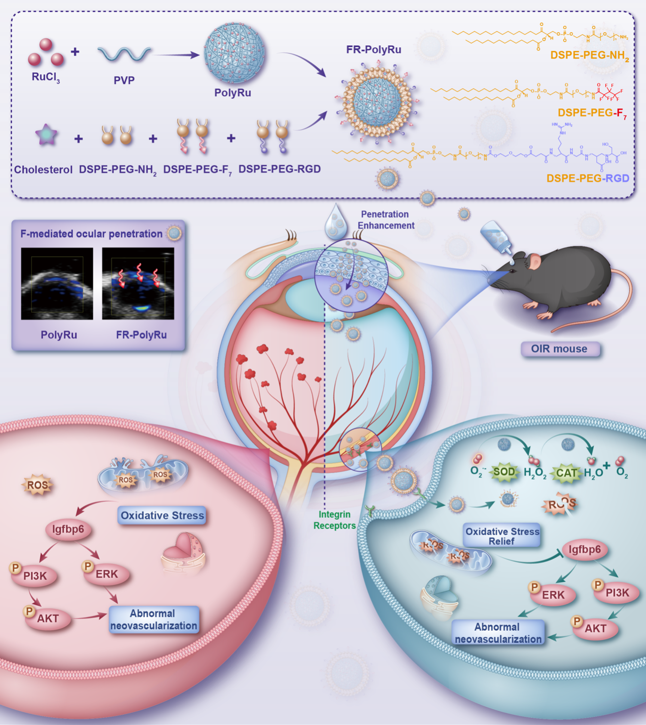 针对上述问题,研究团队开发了一种新型纳米酶滴眼剂FR-PolyRu。FR-PolyRu纳米酶滴眼剂由氟化和RGD修饰的脂质体外壳与内部的PolyRu纳米酶组成。氟化修饰能够降低纳米酶跨膜所需的活化能,显著提升脂质体在角膜和血—视网膜屏障中的穿透性;纳米酶的催化反应可在局部产氧,为药物跨屏障转运提供驱动力;RGD修饰赋予血管靶向能力,使纳米酶在病灶区高效聚集并精准作用。在进入眼底后,FR-PolyRu纳米酶依托其超氧化物歧化酶(SOD)和过氧化氢酶(CAT)级联活性,可持续清除活性氧(ROS),缓解氧化应激,改善局部微环境,从而抑制异常血管生成。在小鼠氧诱导性视网膜病变模型中,FR-PolyRu滴眼治疗显著减少了无灌注区和新生血管面积,并降低视网膜细胞凋亡水平。转录组学分析进一步揭示,FR-PolyRu通过调控Igfbp6/PI3K/AKT等信号通路参与病理血管生成的调节。