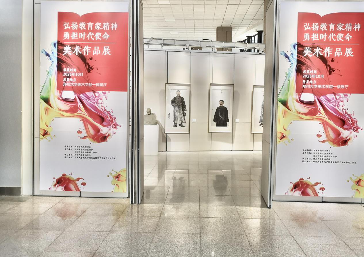 此次展览由河南省美术家协会指导,郑州大学党委宣传部、党委教师工作部主办,美术学院承办,绘画雕塑党支部书记工作室负责具体实施。学院师生历时6个月精心创作,共展出50余件精品力作,涵盖中国画、油画、水彩、雕塑、设计等门类,旨在将教育家精神以艺术化形式呈现。展览围绕教育家精神“理想信念、道德情操、育人智慧、躬耕态度、仁爱之心、弘道追求”六个维度,遴选出一批主题鲜明、艺术表现力强的佳作。作品聚焦人民形象,传递深厚的教育情怀,有以蔡元培、鲁迅、叶圣陶、陶行知等人民教育家为原型的生动刻画;也有描绘嵩阳书院、孔庙等文教古迹,追溯中华教育文明的千年脉络;更有以梅兰竹菊、苍松劲荷等意象,隐喻教育工作者的高洁品格。这些作品凝聚着对“为党育人、为国育才”使命的深入思考,展现出新时代郑大师生积极进取、勇于创新的精神面貌和艺术活力。
