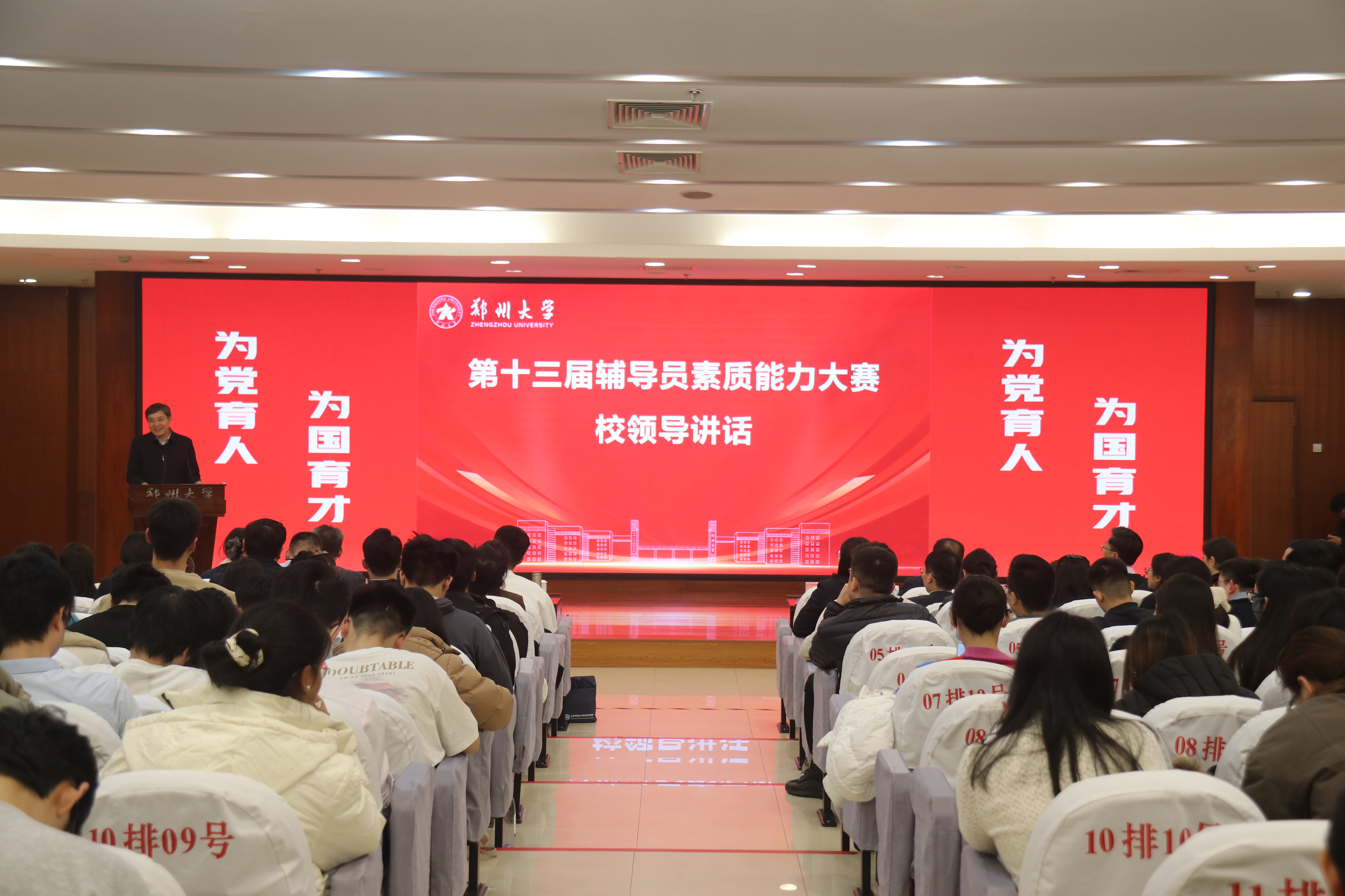 12月19日,由郑州大学党委学生工作部、党委研究生工作部主办,机械与动力工程学院承办的郑州大学第十三届辅导员素质能力大赛(训练营)决赛在主校区举行。校党委副书记王利国,校党委常委、副校长王海杰,河南省教育厅思想政治工作处相关负责同志出席活动。校党委学生工作部、党委研究生工作部、机械与动力工程学院相关负责同志,各学院、各培养单位分管学生工作负责同志、全体专职辅导员及学生代表共同观摩比赛。