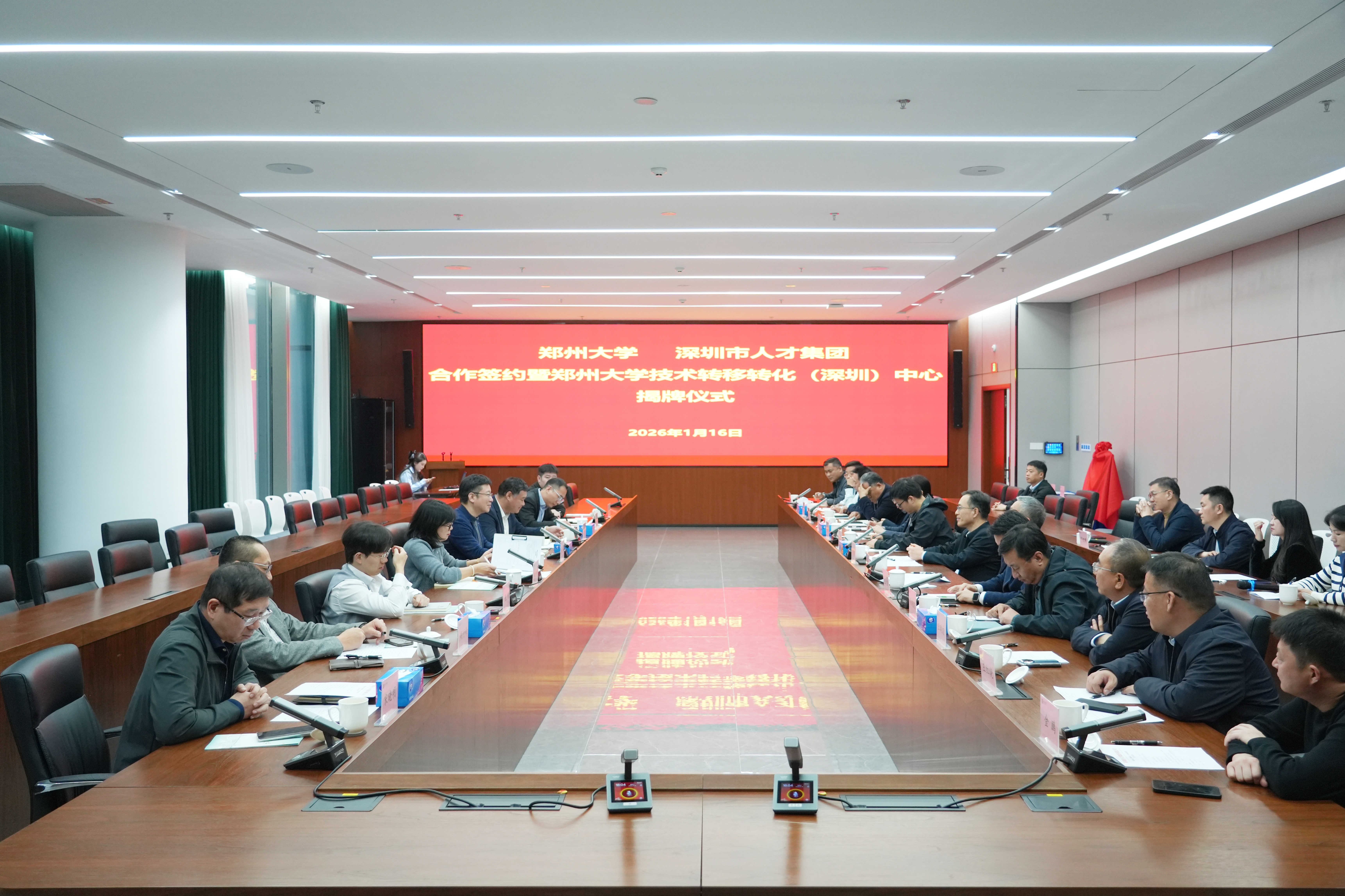 1月16日,郑州大学与深圳市人才集团有限公司在深圳举行合作签约暨郑州大学技术转移转化(深圳)中心揭牌仪式。深圳市人才集团有限公司党委书记、董事长高大伟,党委委员、副总经理张磊;校党委书记李成伟、副校长刘春太;郑州大学深圳校友会执行会长桑英豪、秘书长邓鲲鹏出席活动。学校相关单位负责人参加活动。