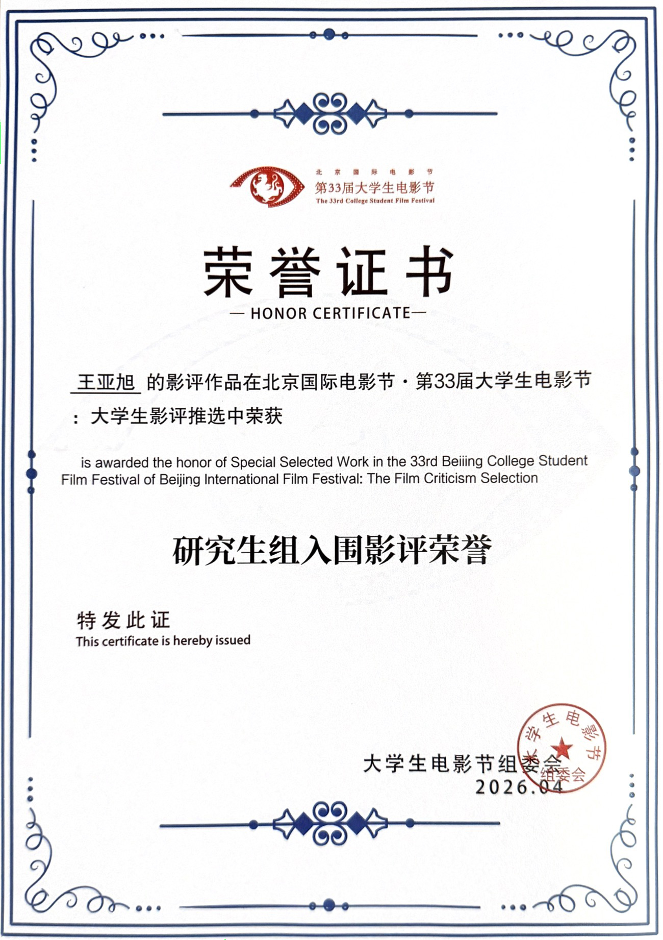 第33届大学生电影节大学生影评推选活动,旨在引导青年学子深耕影视艺术研究,秉持独立审美视角和影视文化思辨,培育青年文艺评论新生力量。我校获奖影评作品由新闻与传播学院2025级硕士研究生王亚旭创作,以黑格尔主奴辩证法为核心视角,梳理《日掛中天》中主奴关系的形成、辩证反转与彻底破裂全过程,结合影片光影符号,深挖作品在亲密关系、道德绑架与自我解放层面的现实内涵与人文反思。