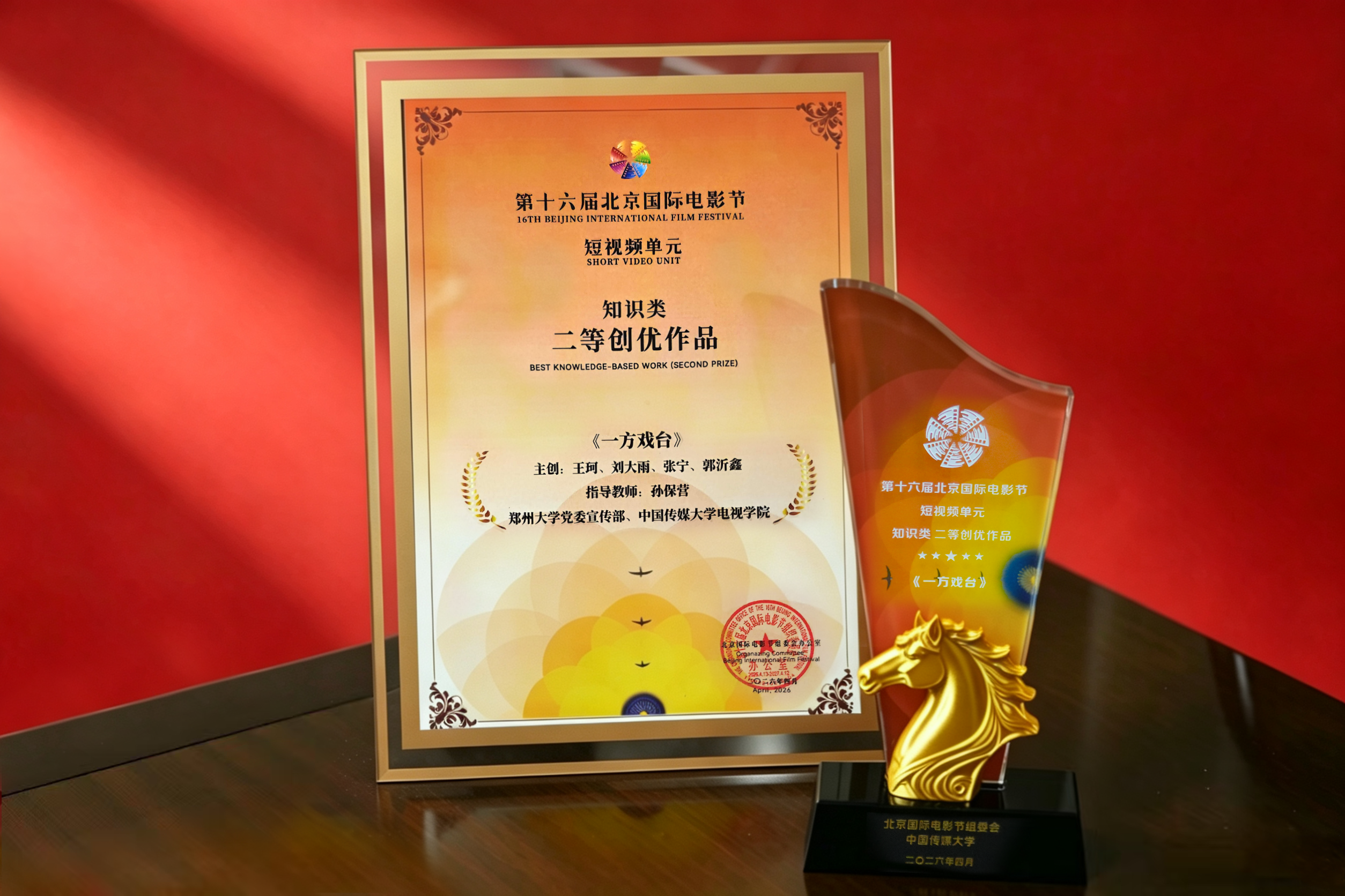 第十六届北京国际电影节短视频单元面向全球征集各类优质短视频作品,由行业领军专家、资深影视创作者、高校专业学者组建专项评审团,历经初审、复审、终审层层遴选,最终评定各类别创优获奖作品。我校获奖短片《一方戏台》由校党委常委、宣传部部长孙保营指导,党委宣传部张宁,校融媒体记者团成员王珂、郭沂鑫等共同创作,聚焦中华优秀传统文化传承发展,运用前沿AIGC技术,以精良画质与巧妙转场,生动展现中国戏曲视听魅力。影片精选京剧、越剧、评剧、豫剧四大剧种经典代表作,还原戏曲服化身段之美,直观呈现不同剧种艺术特色,以年轻化数字化传播手法活化传统文脉,让现代观众沉浸式读懂传统戏曲文化精髓,让古老戏台文化焕发新时代生机。