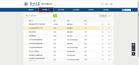 从浏览器输入“https://cms.v.zzu.edu.cn”或登录学校综合服务门户网站后,点击主页左上方的“网上办事大厅”链接直接访问。