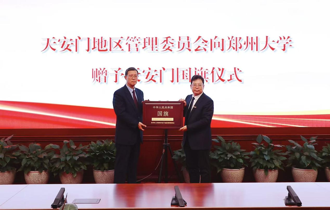 10月31日,北京市人民政府天安门地区管理委员会赠予天安门国旗仪式在北京举行。双方共同签署《国旗赠予协议》。获赠的国旗旗长5米、高3.3米,编号为2018-0091号,曾于2018年6月18日在天安门广场升起,该日期正是学校办学90周年纪念日,也是被确定为郑州大学校庆日和校友返校日的纪念日,这对学校而言,承载着无可替代的纪念意义与深厚情感。学校把这面承载特殊意义的国旗郑重珍藏于档案与校史馆,使其成为传承红色基因的永恒载体和象征。