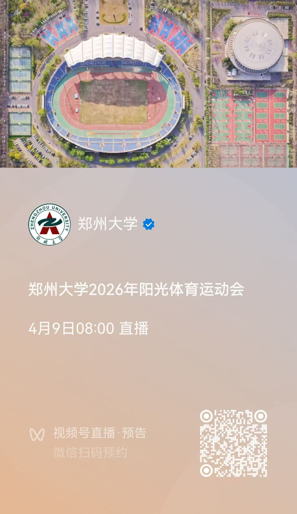 郑州大学2026年阳光体育运动会开幕式将进行线上同步直播,全景展现运动会盛况。欢迎广大师生、校友及家长届时收看。