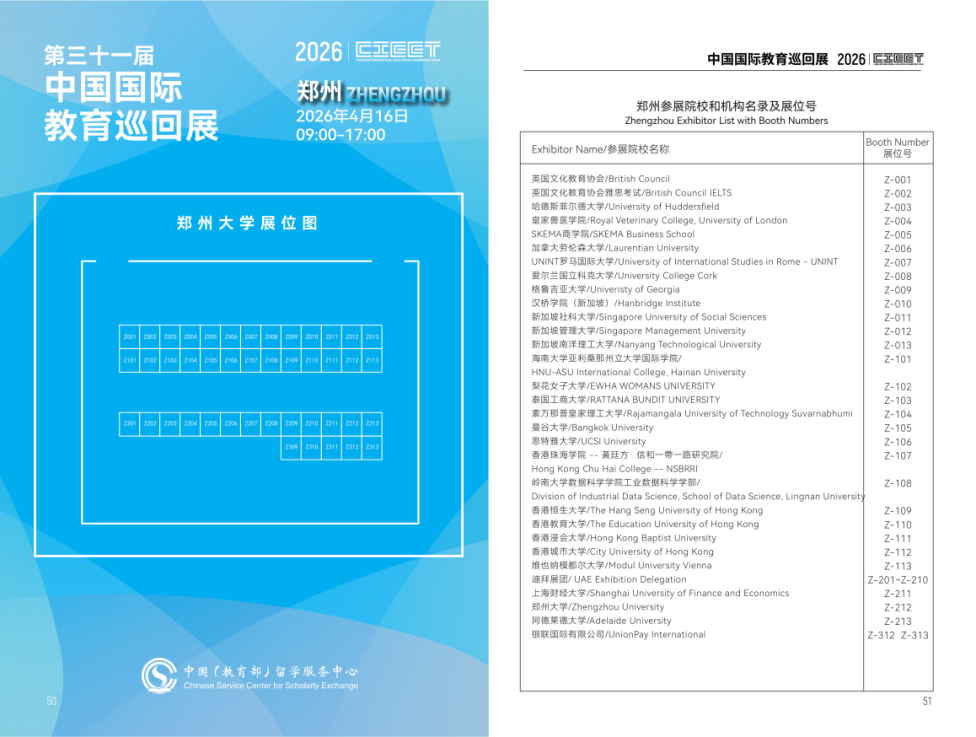 为提升国际化办学水平,拓宽师生国际视野,同时为中原地区广大学生和家长搭建权威、便捷的国际教育交流平台,由中国(教育部)留学服务中心主办、郑州大学承办的“2026中国国际教育巡回展(郑州站)”将于4月16日在我校主校区举行。届时将有来自全球20余个国家和地区的近百所顶尖院校及教育机构齐聚郑大,带来一场集留学咨询、平安留学、学历认证、就业指导于一体的“全周期”服务盛宴。